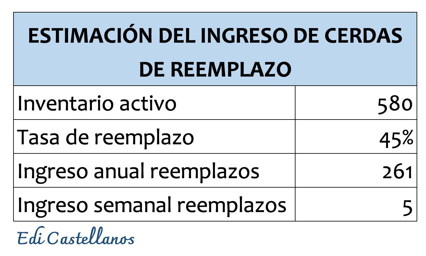 En la siguiente tabla se muestra un ejemplo para hacer la estimación del ingreso de cerdas en un sistema de flujo de producción semanal